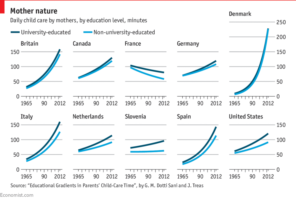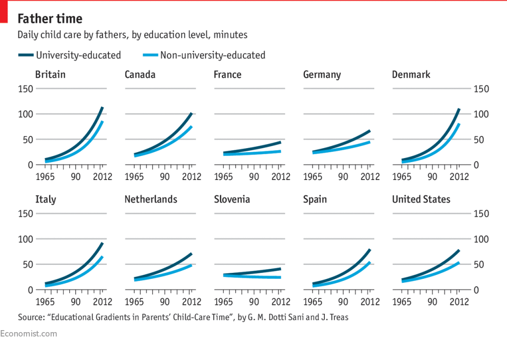 “Părinții din ziua de azi petrec mult mai mult timp cu copiii lor, sau cel puțin părinții clasei de mijloc așa fac. O analiză făcută în 11 țări estimează că mama a petrecut în medie 54 de minute pe zi având grijă de copii în 1965, și 104 minute în 2012. Bărbații petrec mai puțin timp cu copiii decât femeile, dar mult mai mult decât în trecut: timpul lor de îngrijire a copilului a sărit de la 16 minute pe zi, la 59.”